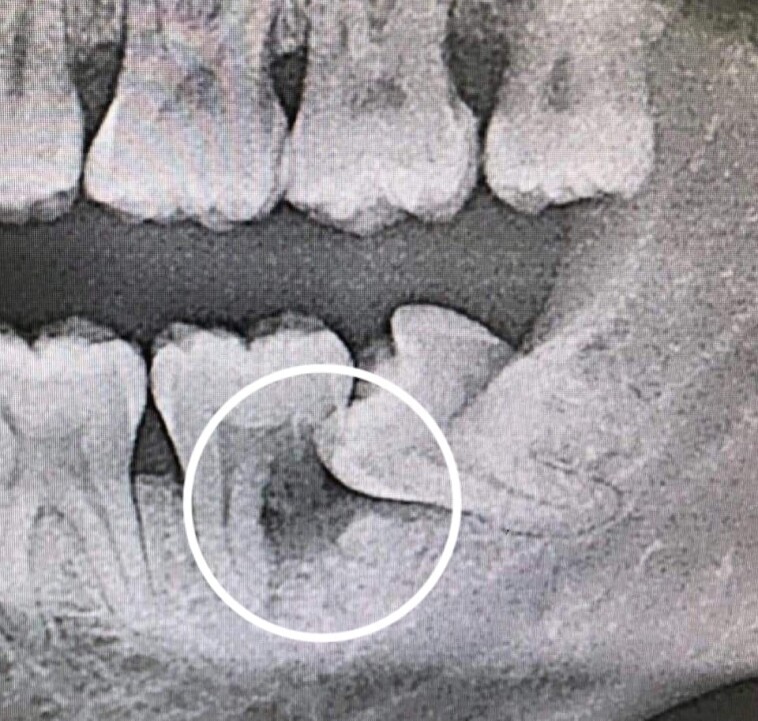 تسوس أو تآكل السن المجاور لضرس العقل بسبب صعوبة التنظيف.